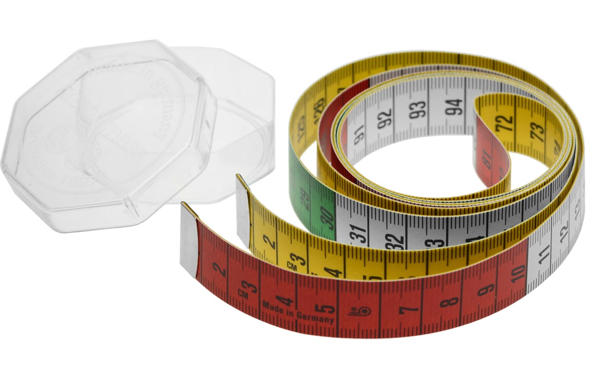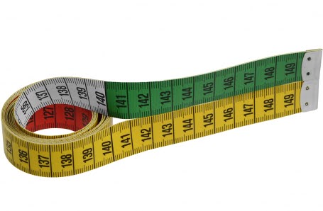 Dubbelzijdig bedrukt meetlint. Eén zijde geel en één zijde is voorzien van kleuraanduiding per decimeter (rood, wit, groen, wit, rood etc.) .