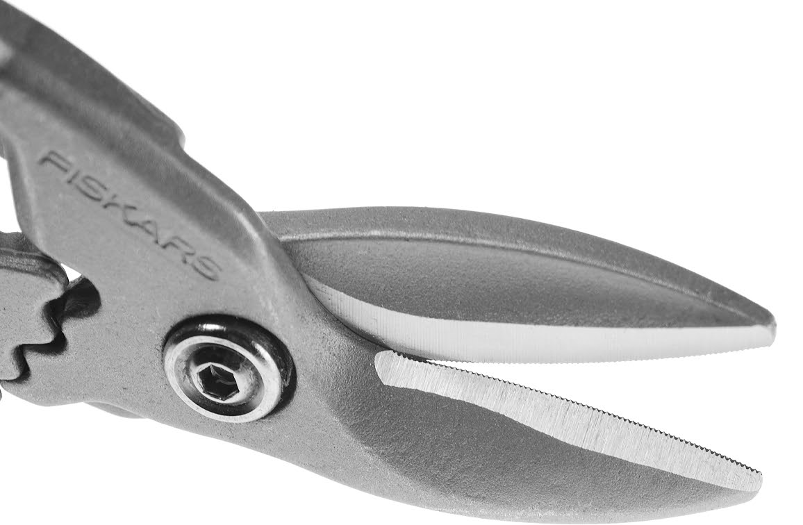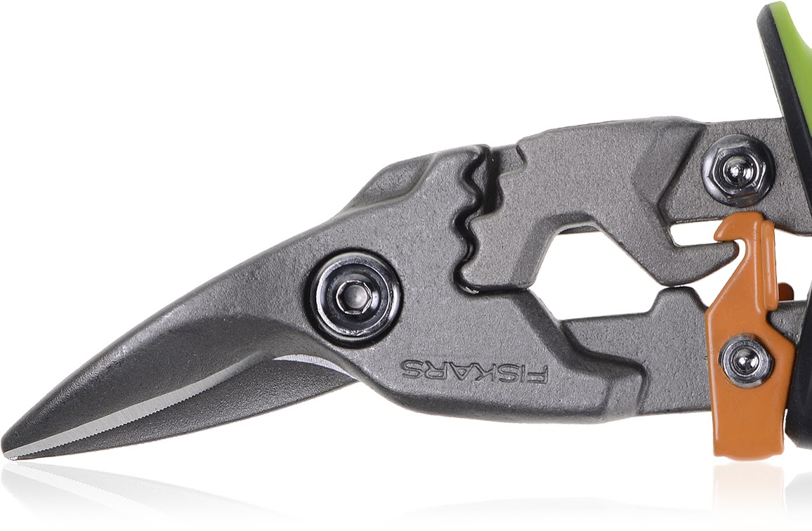 Deze rechts uitgevoerde Fiskars PRO Blikschaar heeft een snijcapaciteit tot 18 gauge koudgewalst staal (1.214 mm) of 22 gauge rvs (0.7937 mm).