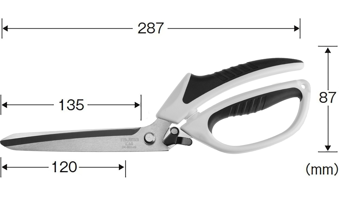De totale lengte van de schaar is: 287 mm, de knipbladen zijn maar liefst 120 mm lang.