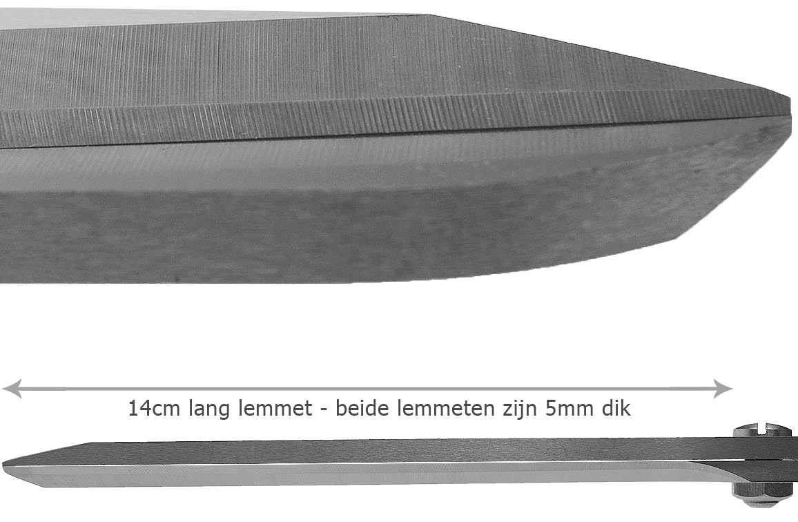 De lemmeten zijn maar liefst 14 cm lang en ca. 5mm per lemmet dik. Zeer geschikt voor het knippen van dik textiel als tapijt, kleding en gordijnen. Maar ook geschikt voor het knippen van o.a. leer, dik folie / karton, linoleum en soortgelijke materialen.