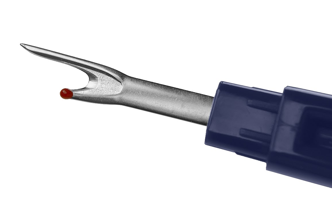 De andere tand van de vork is korter en heeft een stompe punt, hierdoor worden beschadigingen aan de stof voorkomen.