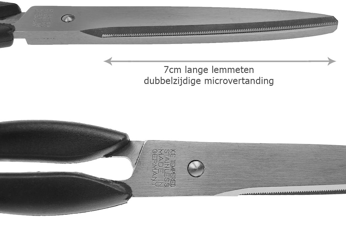 De schaar is beschikt over tweezijdige microvertanding en is gemaakt van extra gehard Dura Staal.