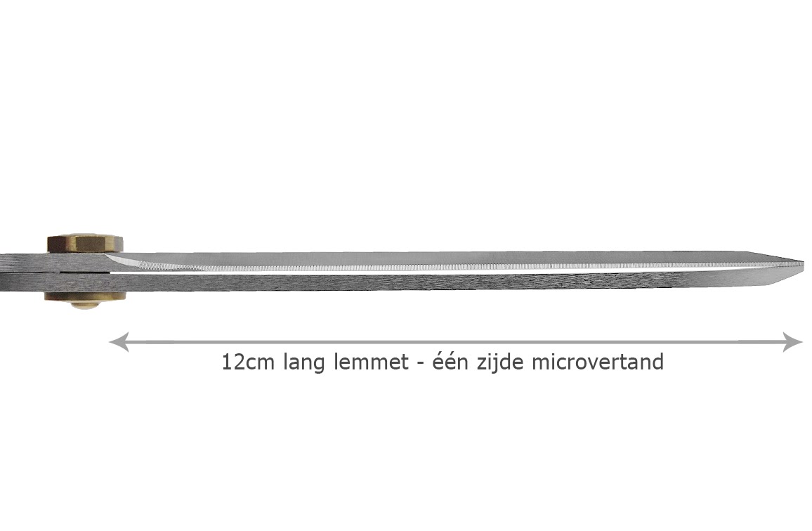 Daarnaast beschikt één van de twee lemmeten over microvertanding, het andere lemmet is glad, gemaakt van extra gehard staal.