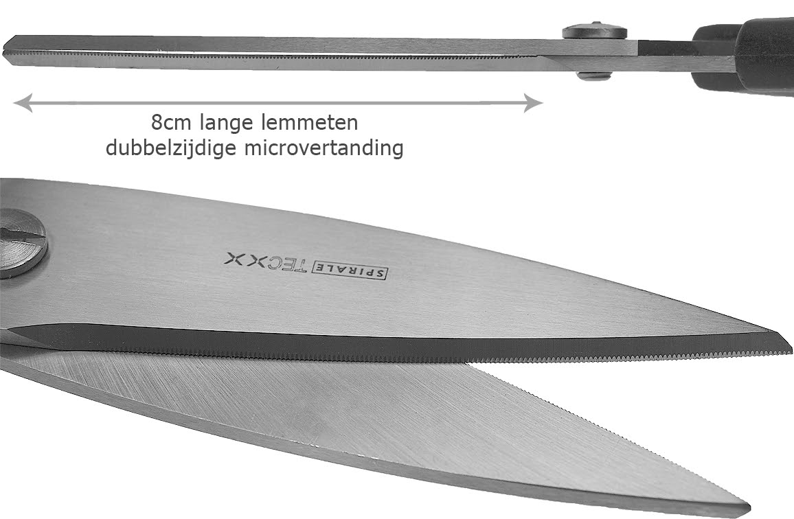De schaar beschikt over tweezijdige microvertanding en is gemaakt van Dura Staal. De schaar beschikt over een kabelknipper en is geschikt voor zowel links- als rechtshandig gebruik.